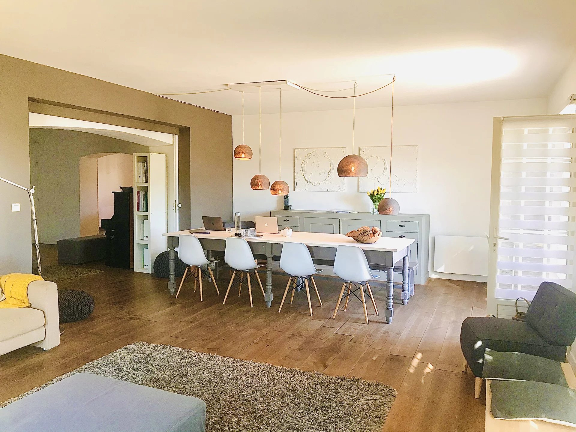 The master house (approx. 250m2), built on two levels, radiates energy, true freedom and serenity . The play of light, the comfy volumes and open living spaces with contemporary design - living room and dining room (60m2), semi-open kitchen, air-conditioned master suite with dressing and bathroom, 2 bedrooms and 1 shower room, office space, summer kitchen - create a gentle harmony, favouring a southern rhythm of inside-outside living . A utility room, laundry room and cellar complete the ensemble.